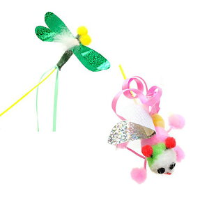 今回紹介するのはドギーマン(キャティーマン)から発売されている『じゃれ猫ブンブン』です。緑のトンボとピンクのミツバチの2種類です。どちらもキラキラの羽とリボンが付いていていて猫の興味をそそるデザイン。